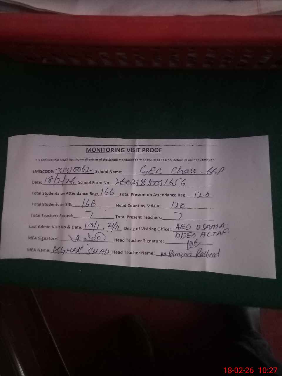 | Attendance Register | Head Teacher | MEA with School | Visit Proof |