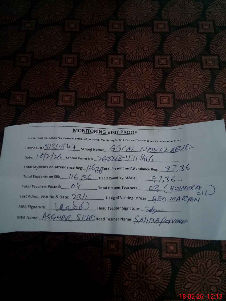 | Attendance Register | Head Teacher | MEA with School | Visit Proof |