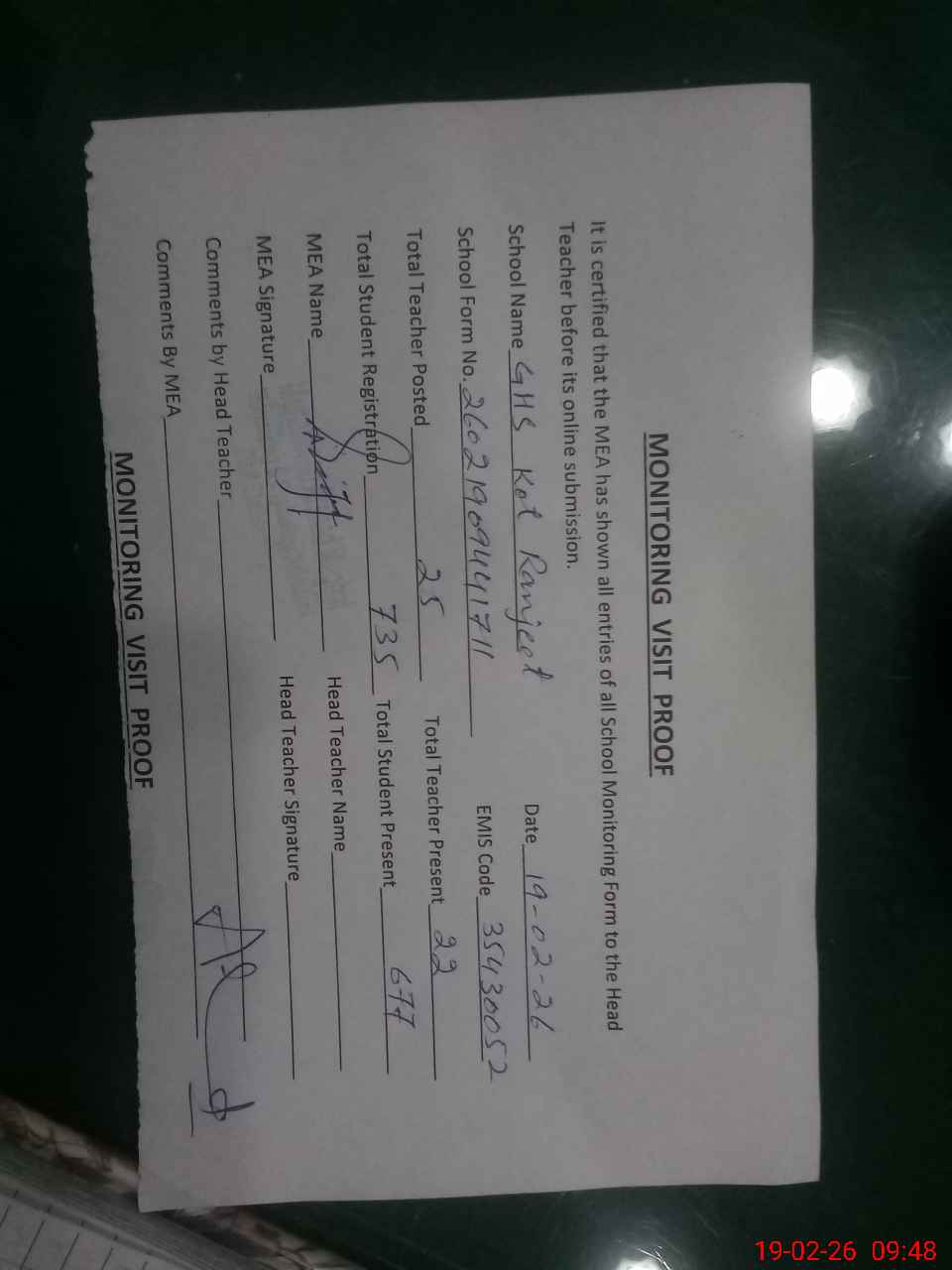 | Attendance Register | Head Teacher | MEA with School | Visit Proof |