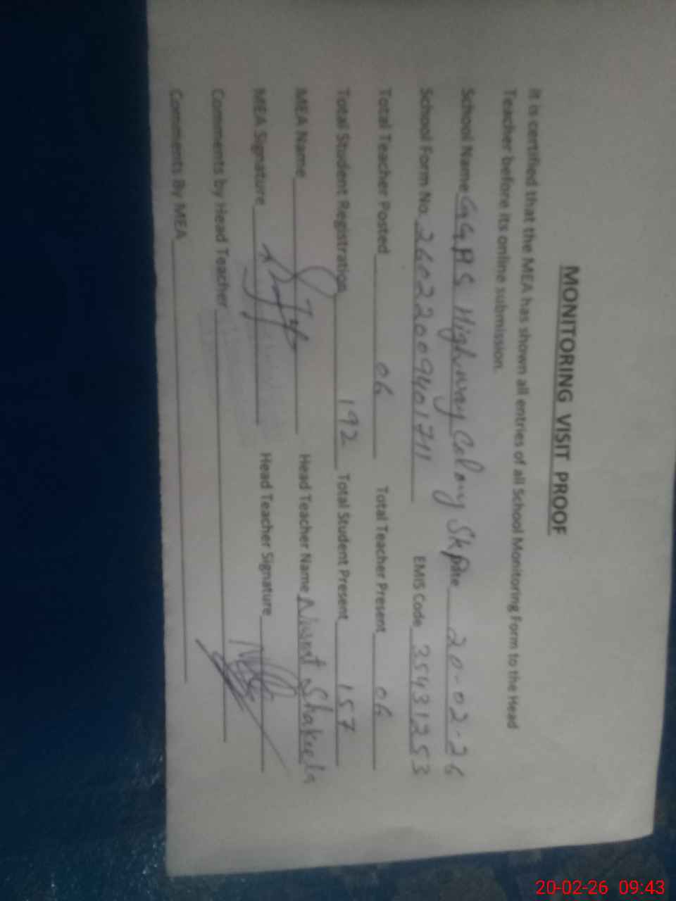 | Attendance Register | Head Teacher | MEA with School | Visit Proof |