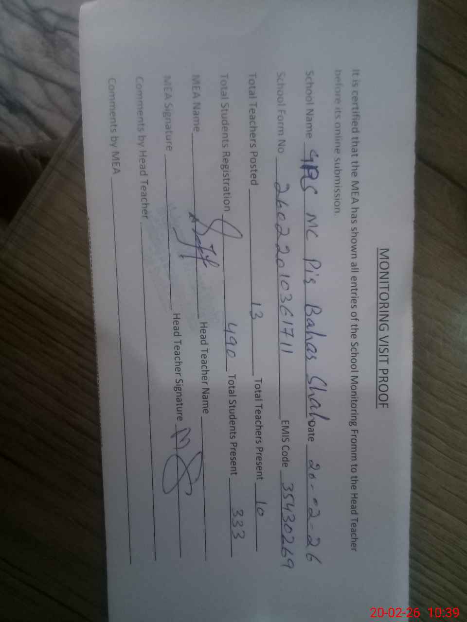 | Attendance Register | Head Teacher | MEA with School | Visit Proof |