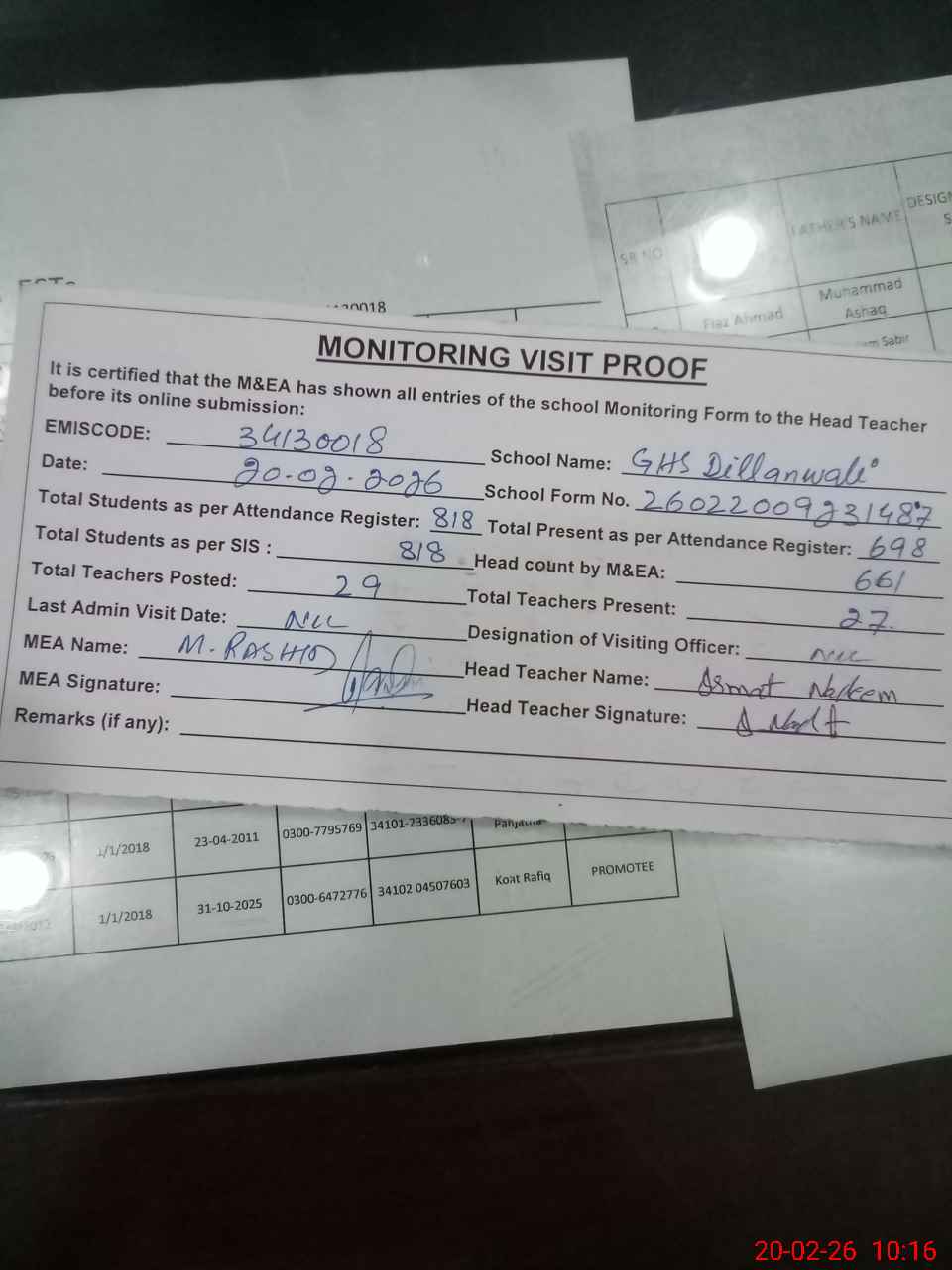| Attendance Register | Head Teacher | MEA with School | Visit Proof |