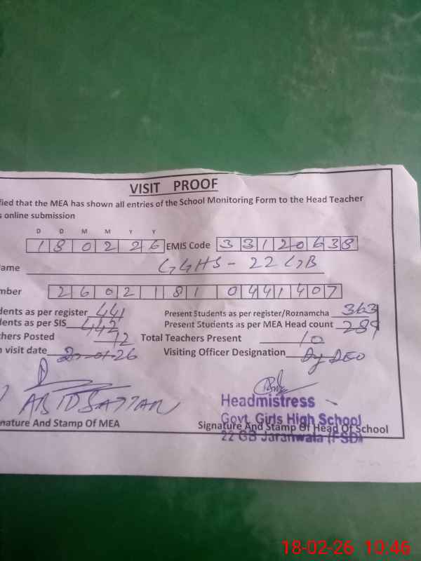 | EMIS Code: 33120638 | Name of School: GGHS CHAK NO 22 GB | |||
