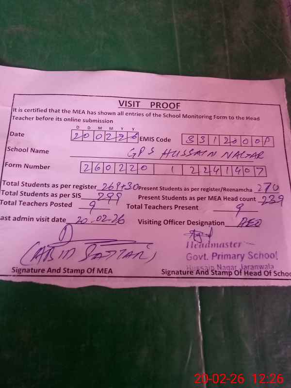 | EMIS Code: 33120009 | Name of School: GPS HASSAIN NAGAR JARANWALA | |||