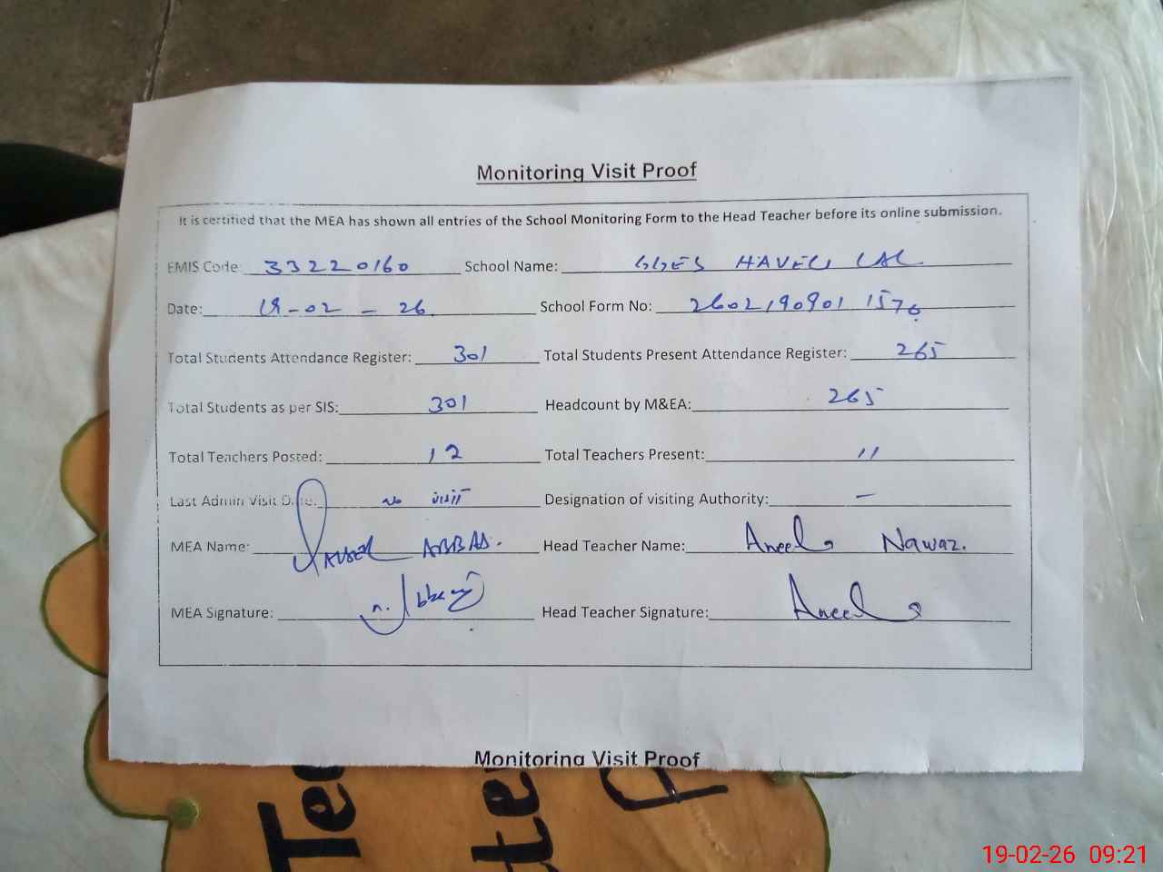 | Attendance Register | Head Teacher | MEA with School | Visit Proof |