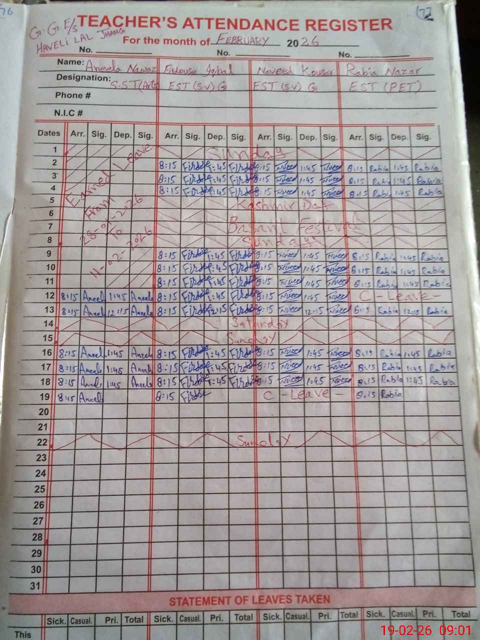| CNIC | Full Name | Designation | R/C | Absence During Last Calender Month |