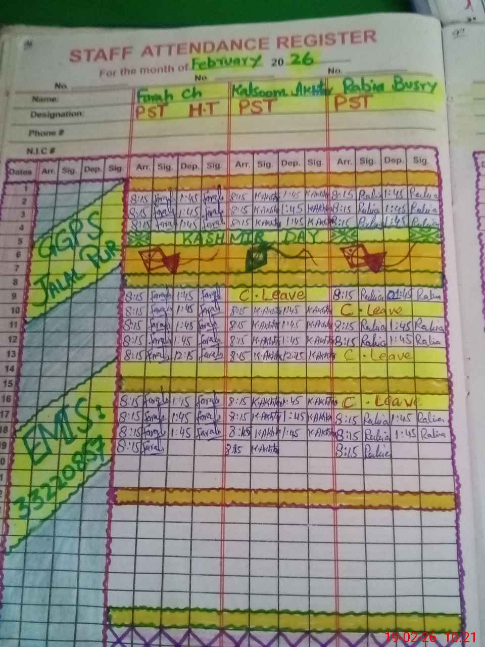 | CNIC | Full Name | Designation | R/C | Absence During Last Calender Month |