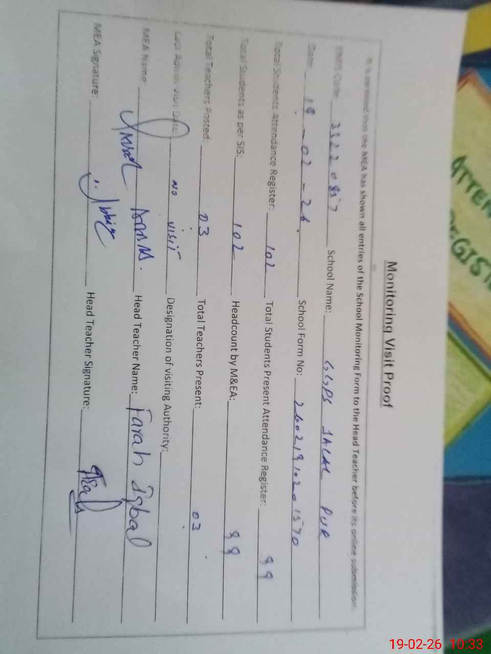 | Attendance Register | Head Teacher | MEA with School | Visit Proof |