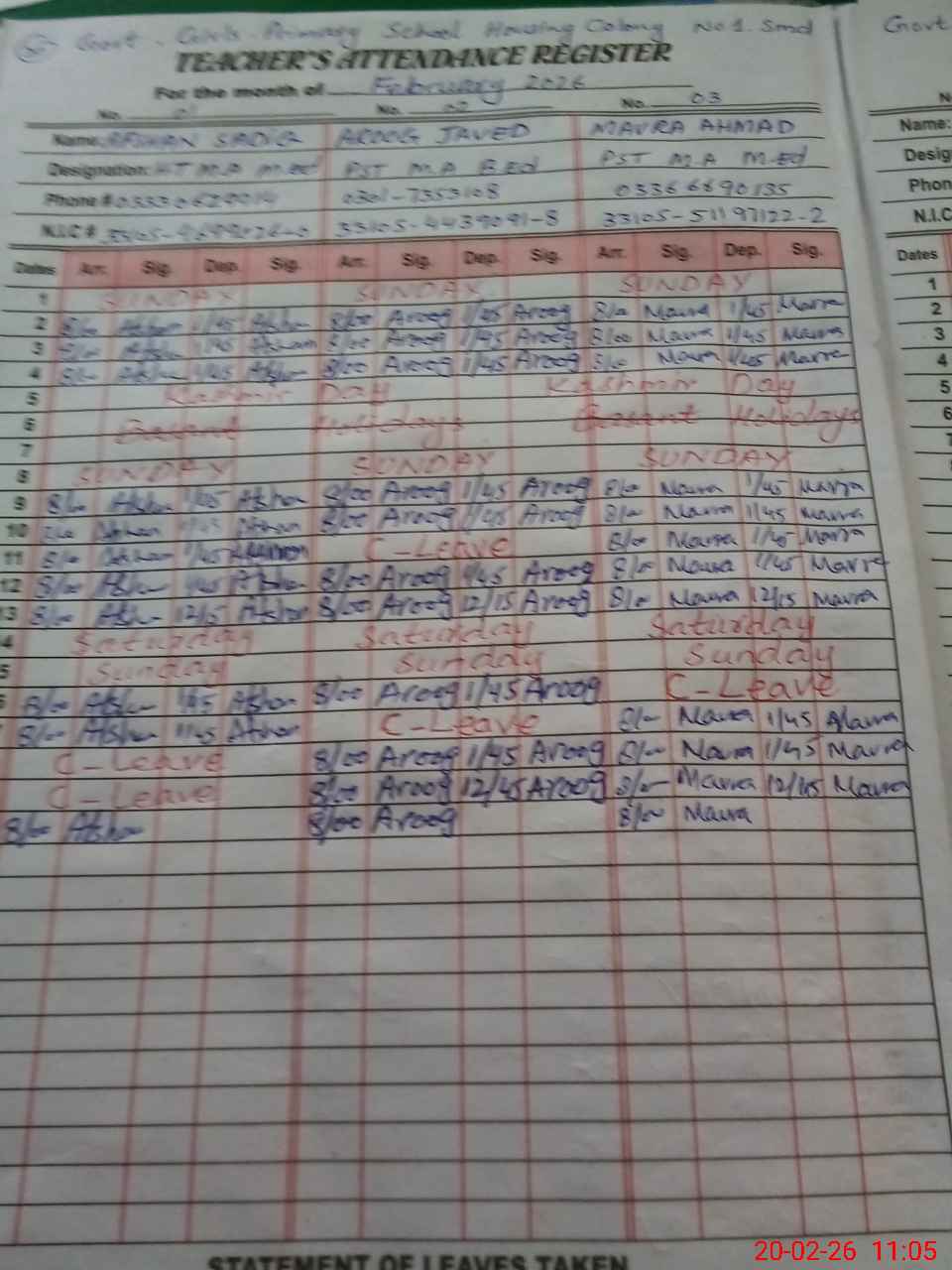 | CNIC | Full Name | Designation | R/C | Absence During Last Calender Month |