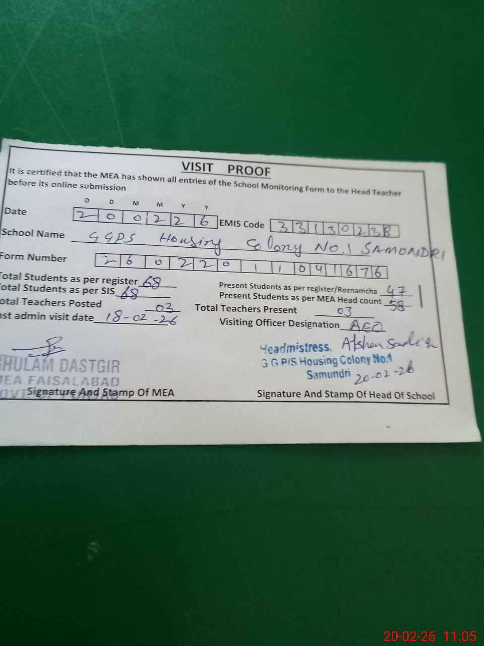 | Attendance Register | Head Teacher | MEA with School | Visit Proof |