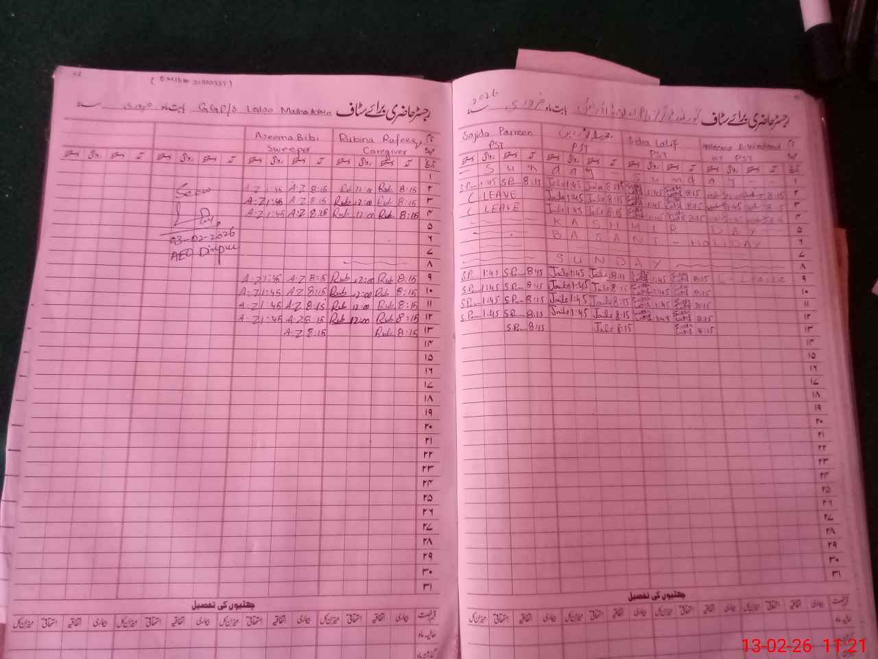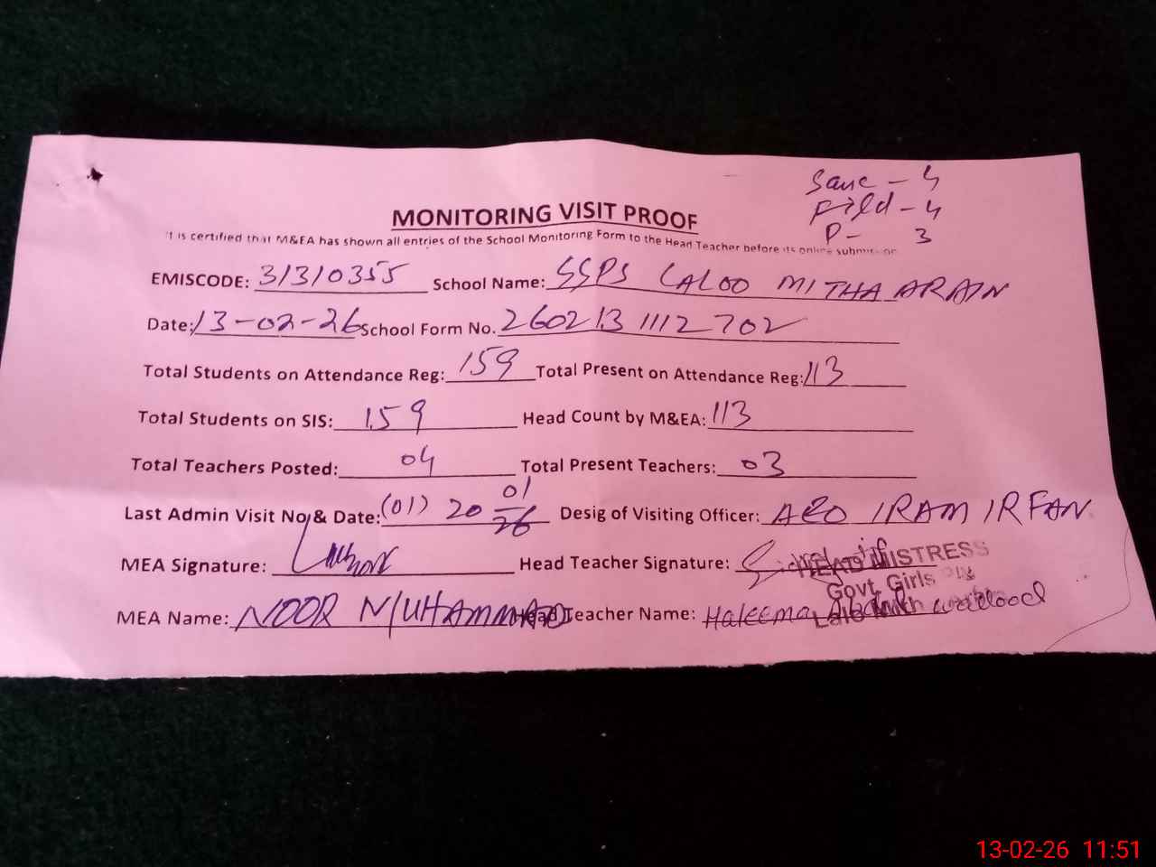 | Total no. of Classrooms: 1 No. of Classrooms Used for Teaching: 1 No. of Classrooms Storing Old Furniture, FTBs, etc: 0Comments if Any: Satisfactory building provided by local community Teacher PST Haleema Abdul Wadood is absent from the school sanctioned leave not produce by acting head NSB record incomplete cash book |