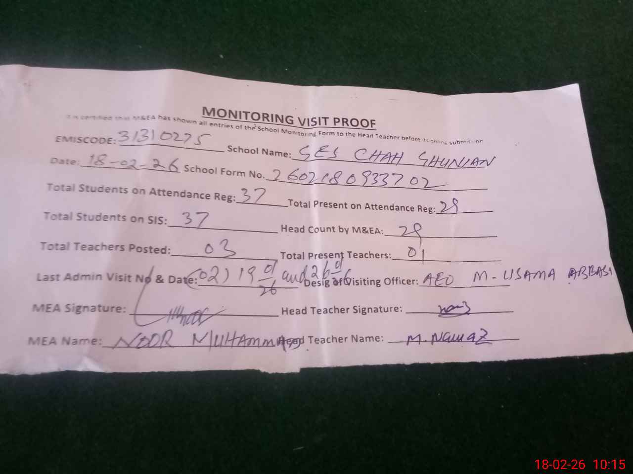 | Attendance Register | Head Teacher | MEA with School | Visit Proof |