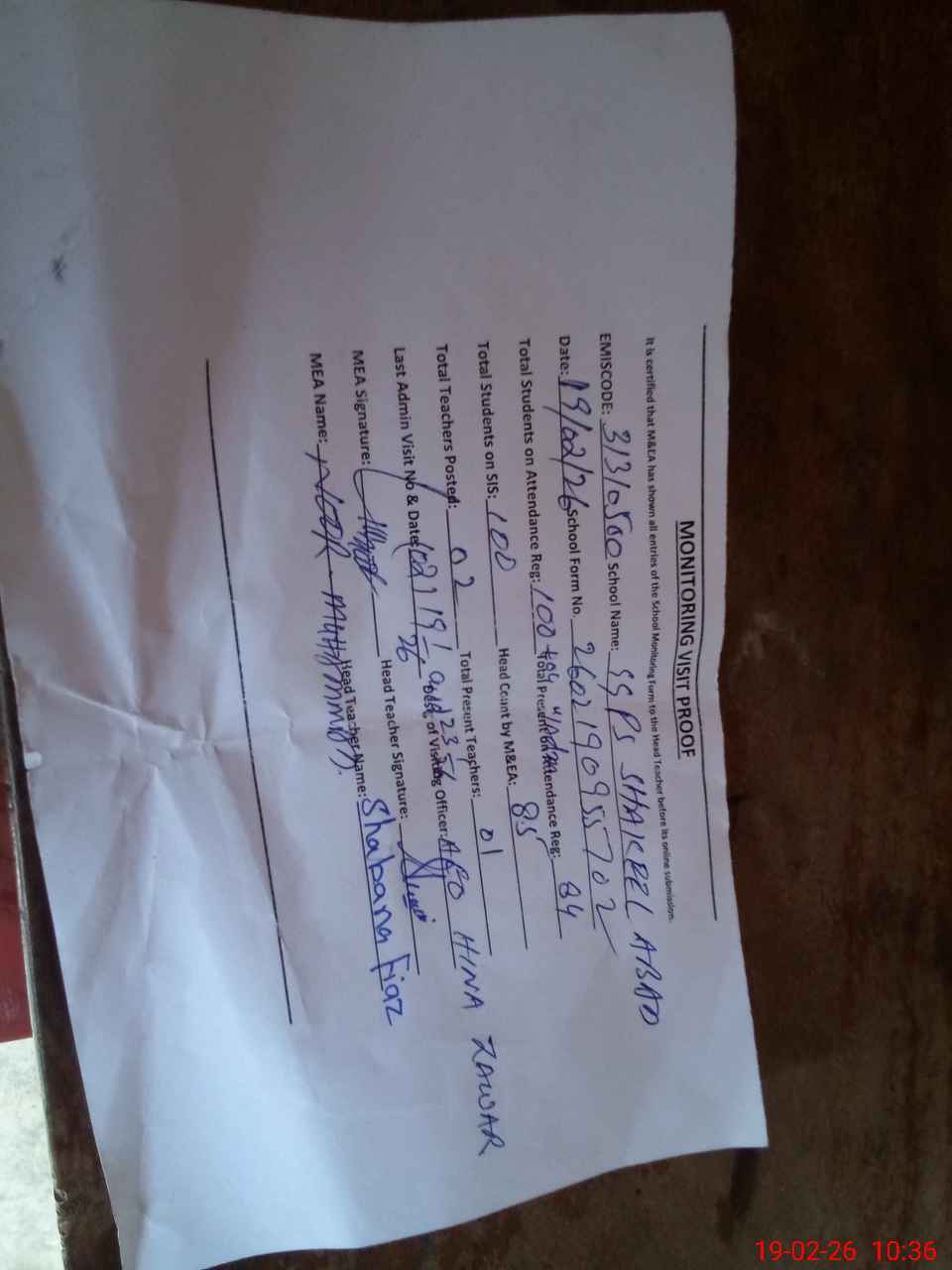 | Attendance Register | Head Teacher | MEA with School | Visit Proof |