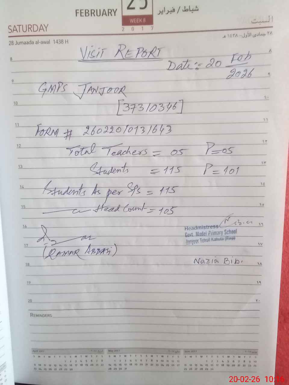 | Attendance Register | Head Teacher | MEA with School | Visit Proof |