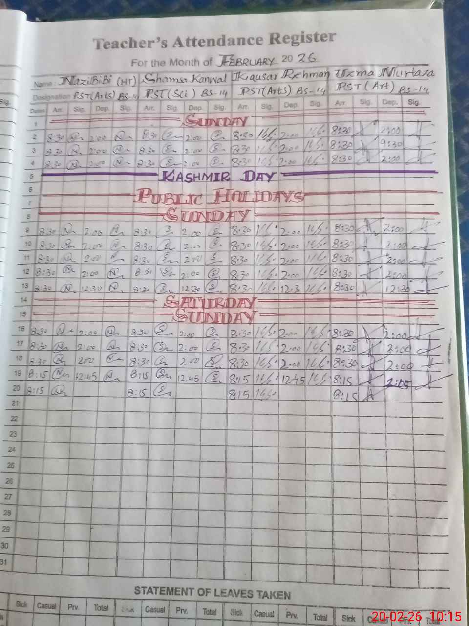 | Monitoring Date: 20-02-2026 | Start Time: 20-02-2026 09:52 AM | End Time: 20-02-2026 10:16 AM | Name of MEA: Qa**** Za**** | |