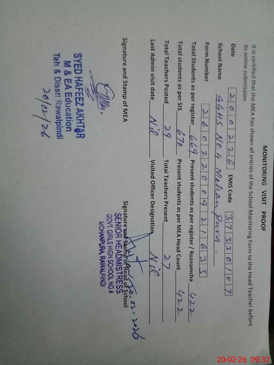 | Attendance Register | Head Teacher | MEA with School | Visit Proof |