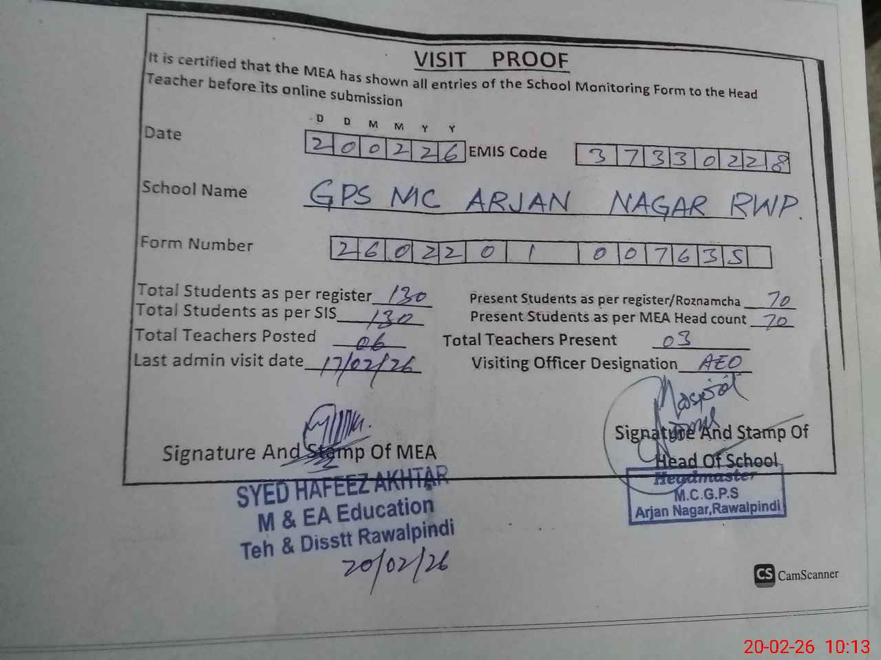 | EMIS Code: 37330228 | Name of School: GPS MC ARJAN NAGAR RAWALPINDI | |||