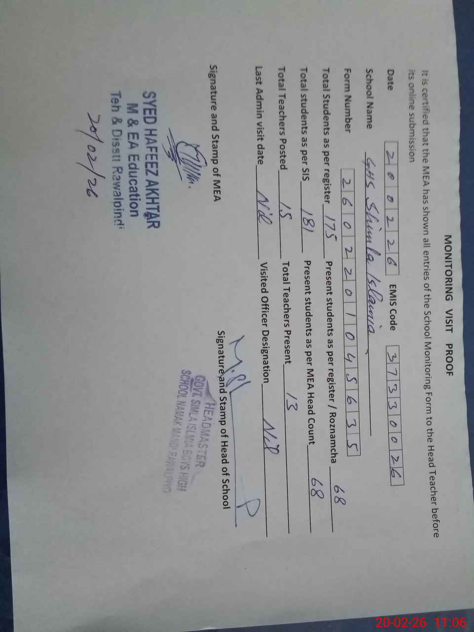 | EMIS Code: 37330026 | Name of School: GHS SIMLA ISLAMIA | |||