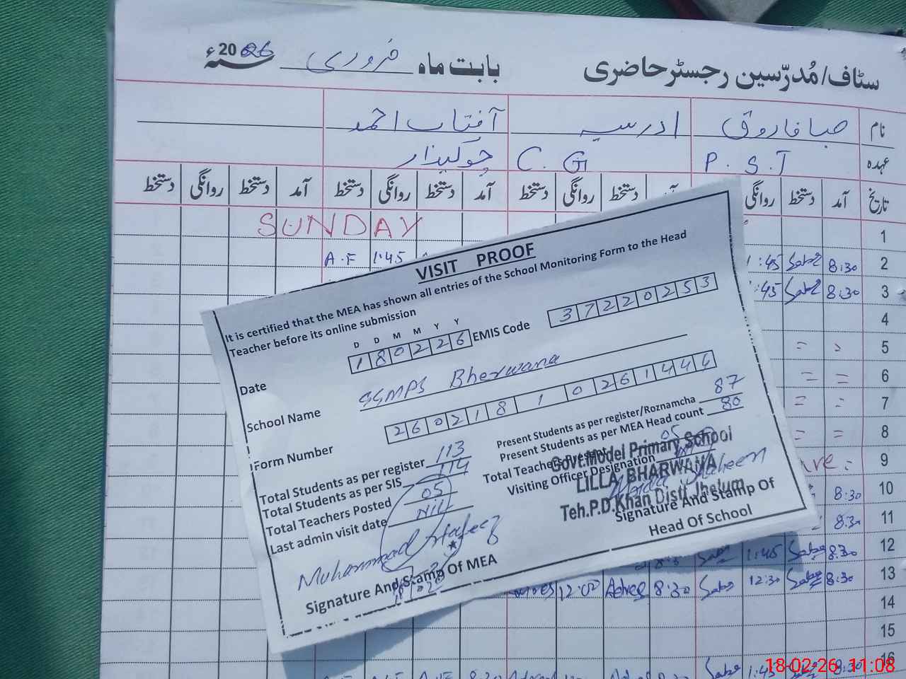| Remarks (Use Separate Page if Required): Sir Students of one and three classes are sitting on mud ground in open air. PST Teacher Shumaila interference and given wrong state of ECE class students. List of students not enrolled but teacher Shumaila tell only one student sitting extra in class. On students attendance register not complete not maintain attendance of 18-2-2026. Care giver no complete knowledge about | |||||