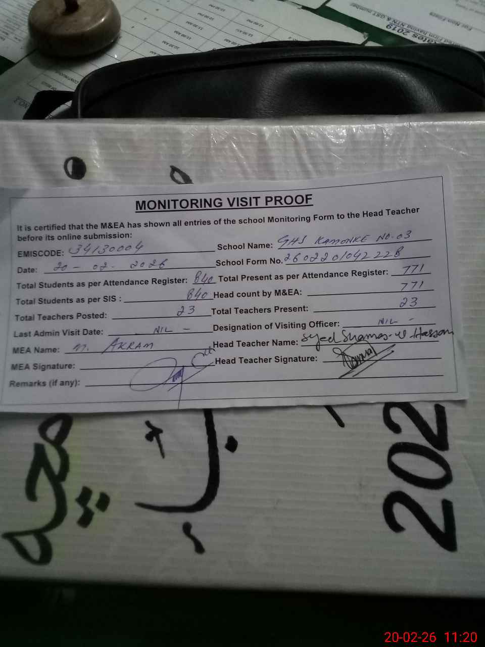 | Attendance Register | Head Teacher | MEA with School | Visit Proof |