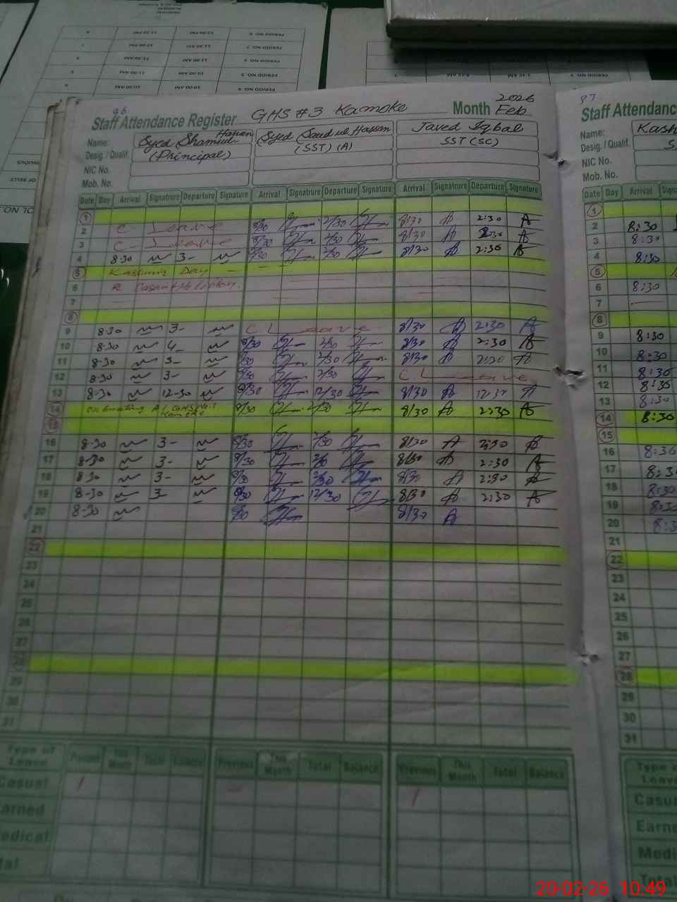 | CNIC | Full Name | Designation | R/C | Absence During Last Calender Month |