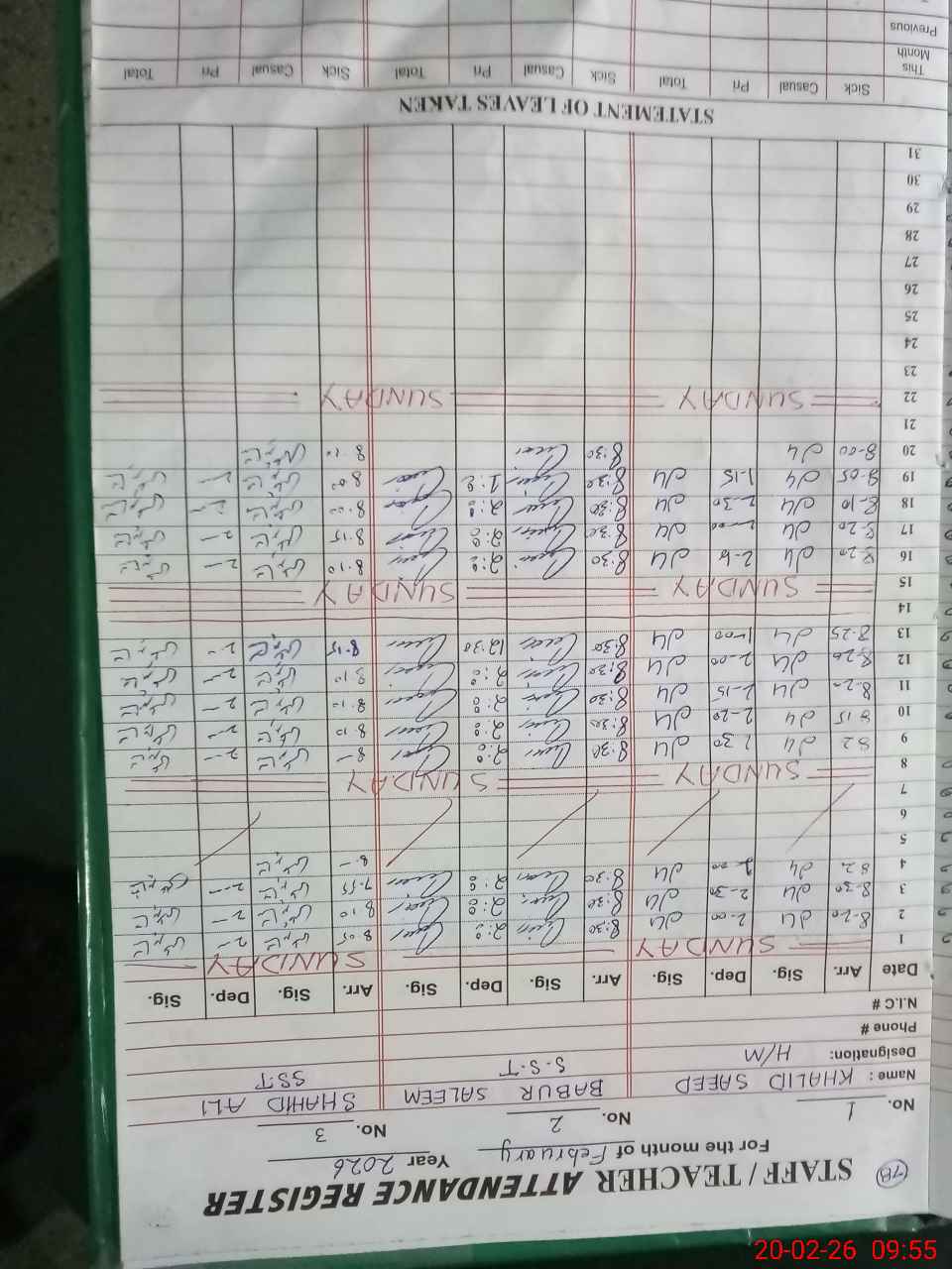 | CNIC | Full Name | Designation | R/C | Absence During Last Calender Month |