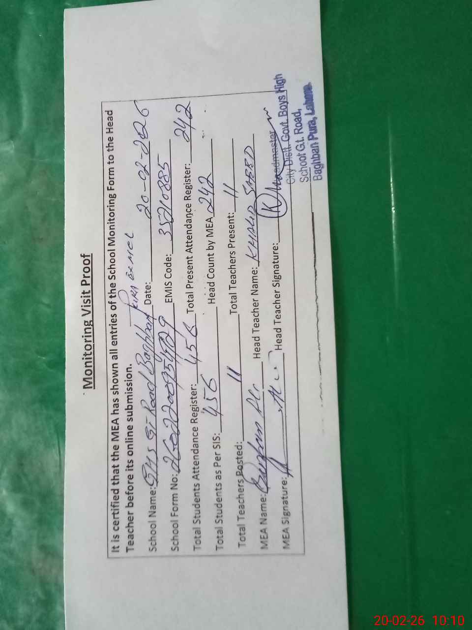| Attendance Register | Head Teacher | MEA with School | Visit Proof |