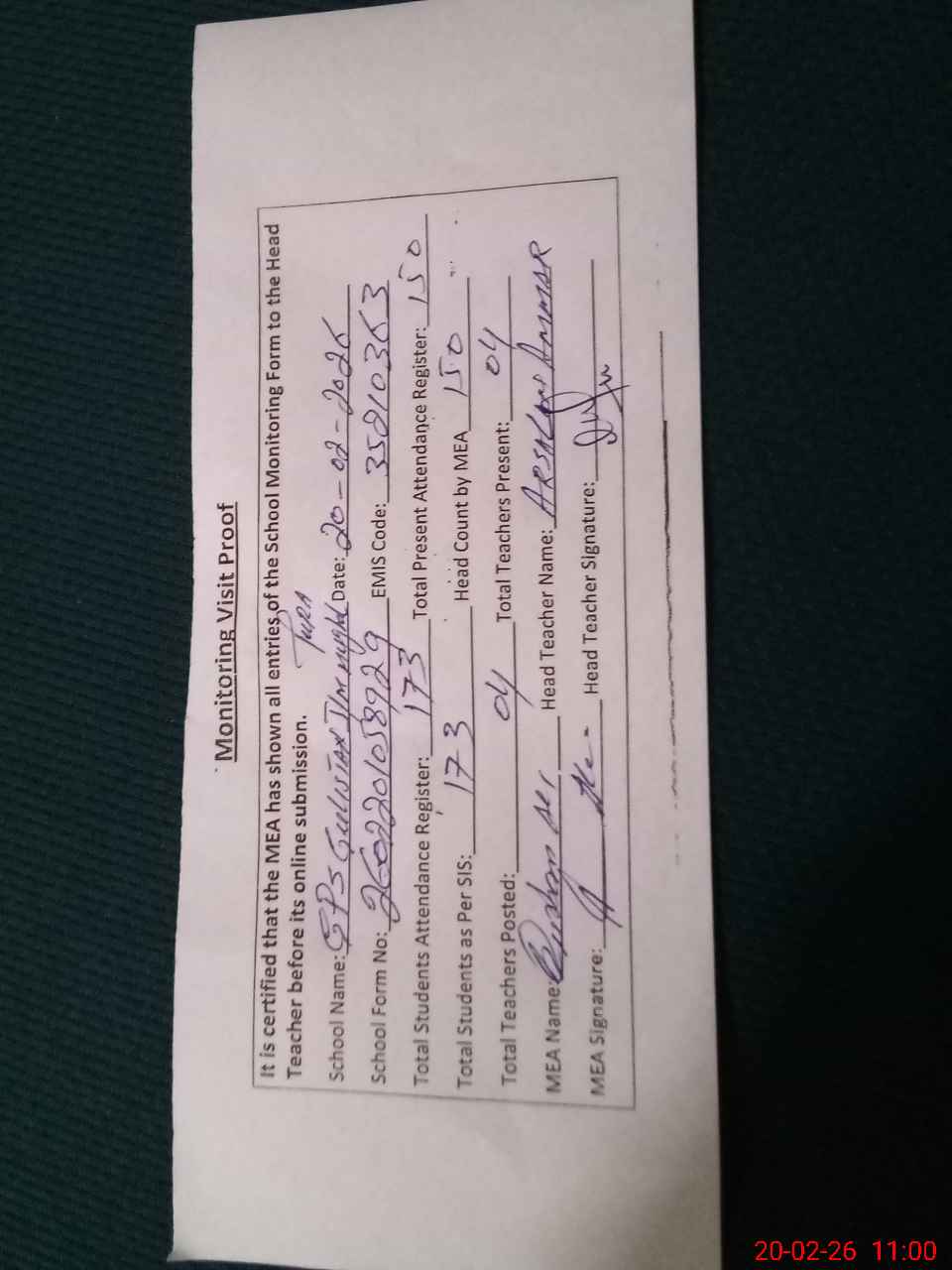 | Attendance Register | Head Teacher | MEA with School | Visit Proof |