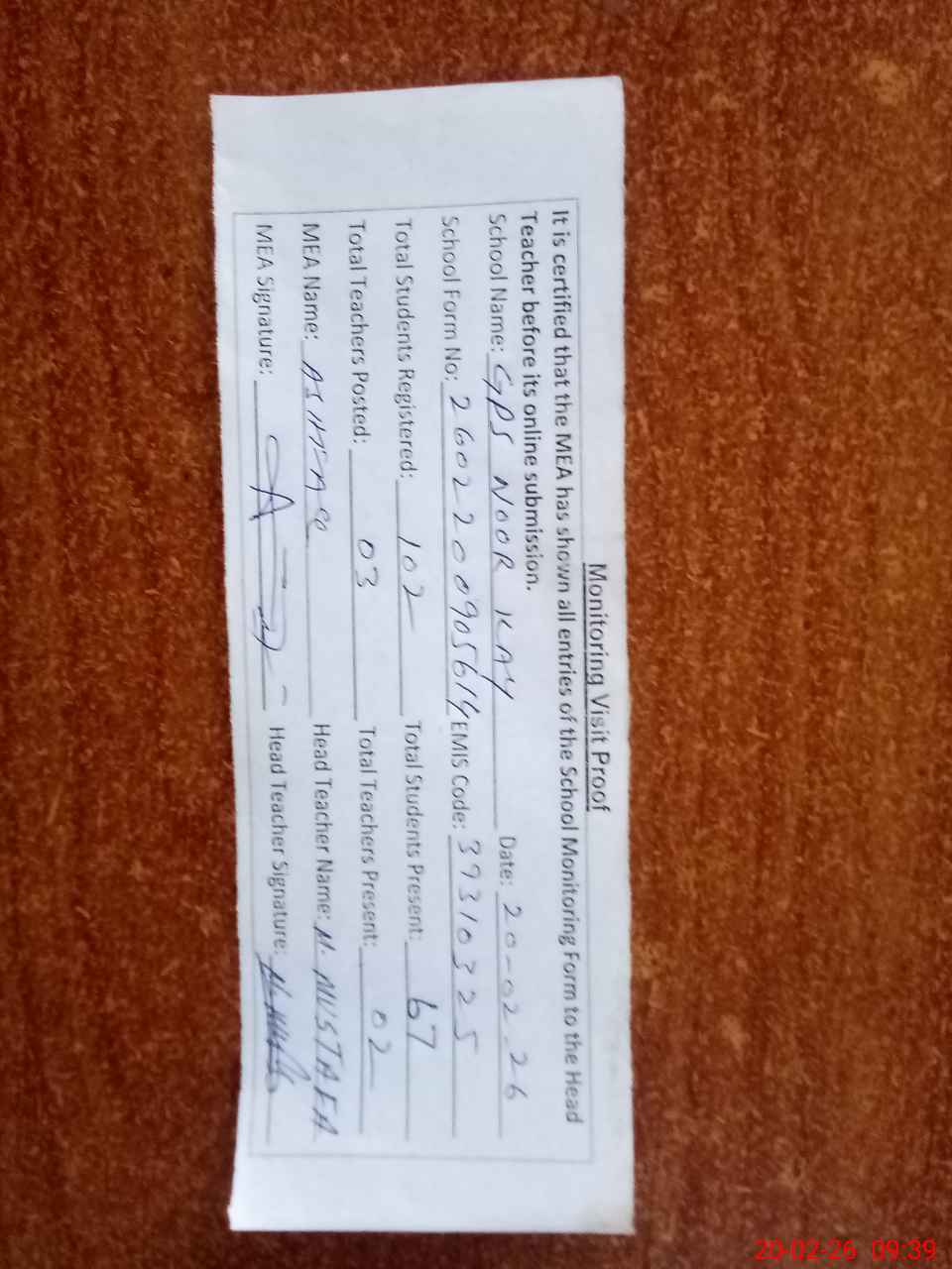 | Attendance Register | Head Teacher | MEA with School | Visit Proof |