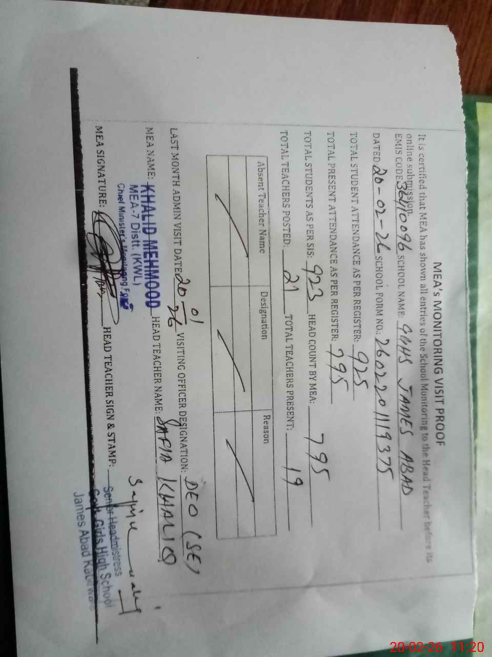| EMIS Code: 36410096 | Name of School: GGHS JAMES ABAD, KABIRWALA | |||