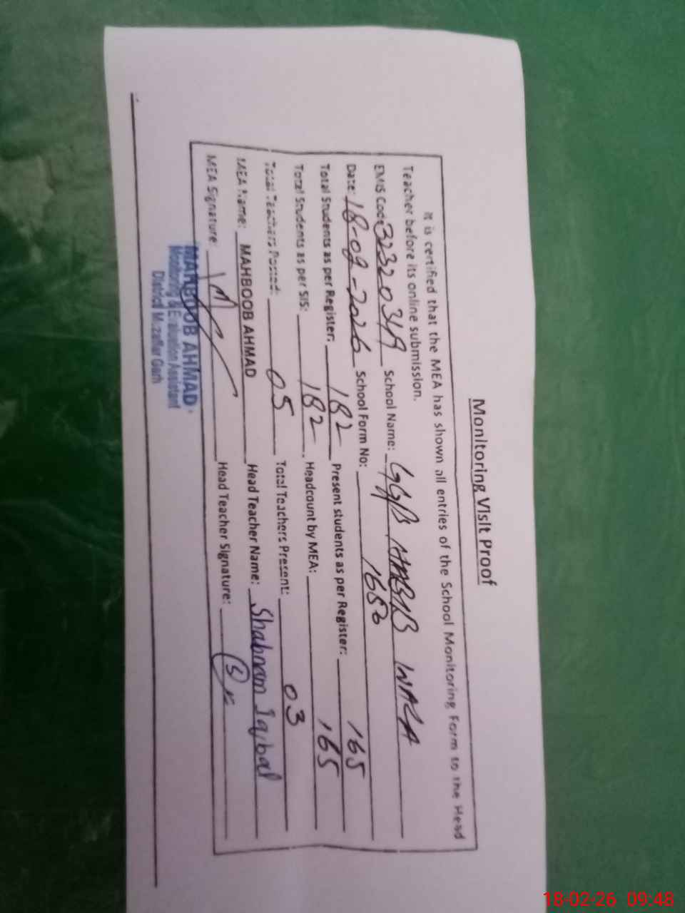 | Attendance Register | Head Teacher | MEA with School | Visit Proof |