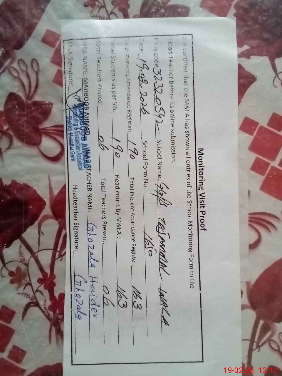 | Attendance Register | Head Teacher | MEA with School | Visit Proof |