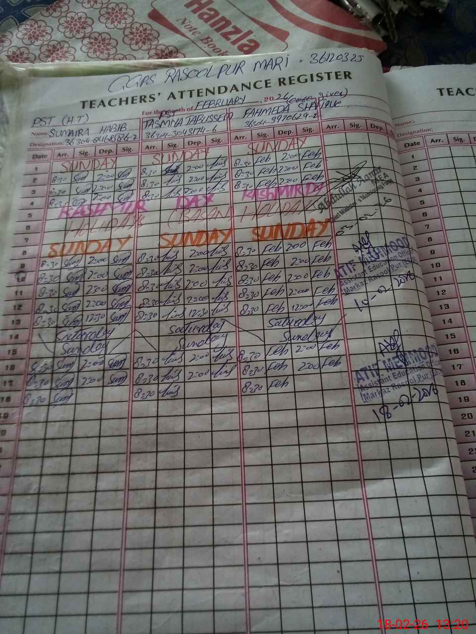 | Name: Su**** Ha**** Designation: (School Headmaster's/Headmistress's) PST/PTC/JV Phone/Cell Number: 03**** |