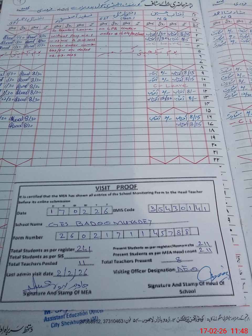 | Attendance Register | Head Teacher | MEA with School | Visit Proof |