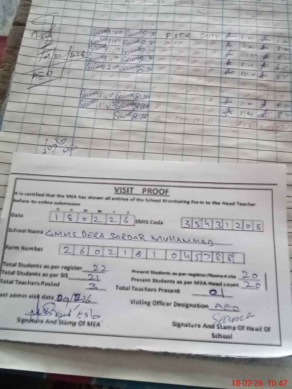 | Attendance Register | Head Teacher | MEA with School | Visit Proof |
