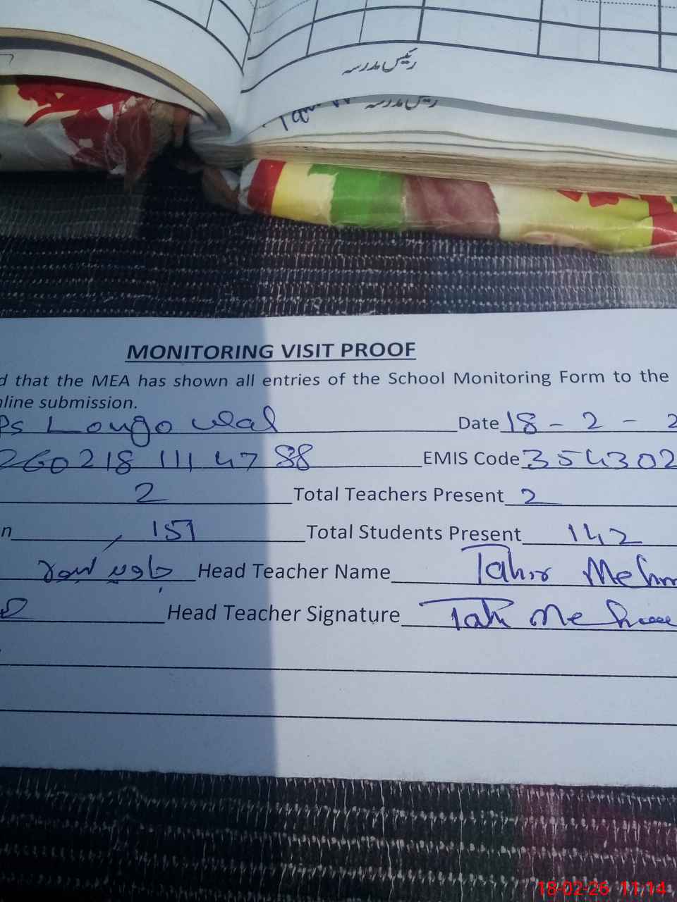 | Attendance Register | Head Teacher | MEA with School | Visit Proof |