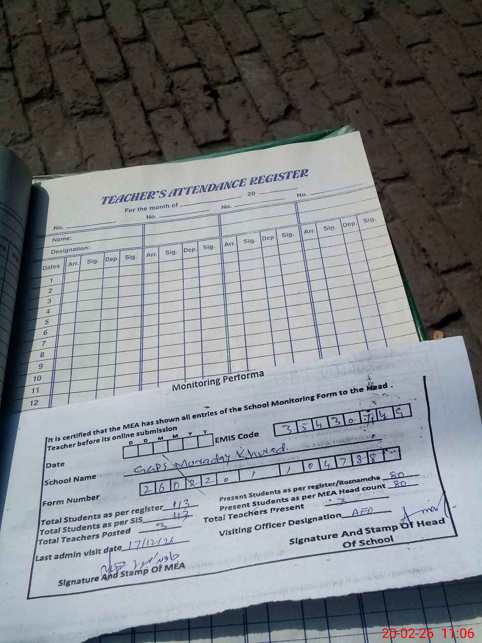 | Attendance Register | Head Teacher | MEA with School | Visit Proof |