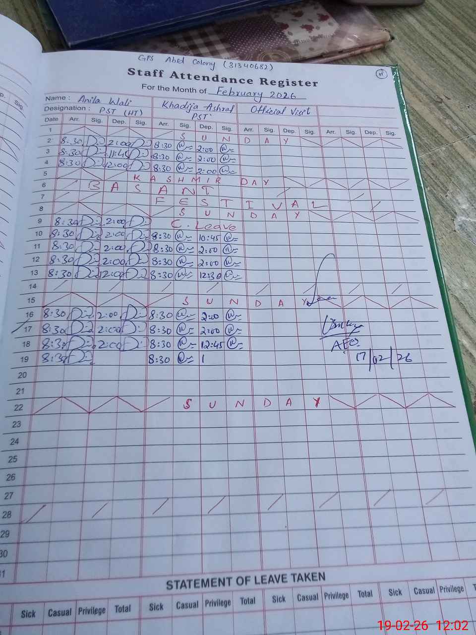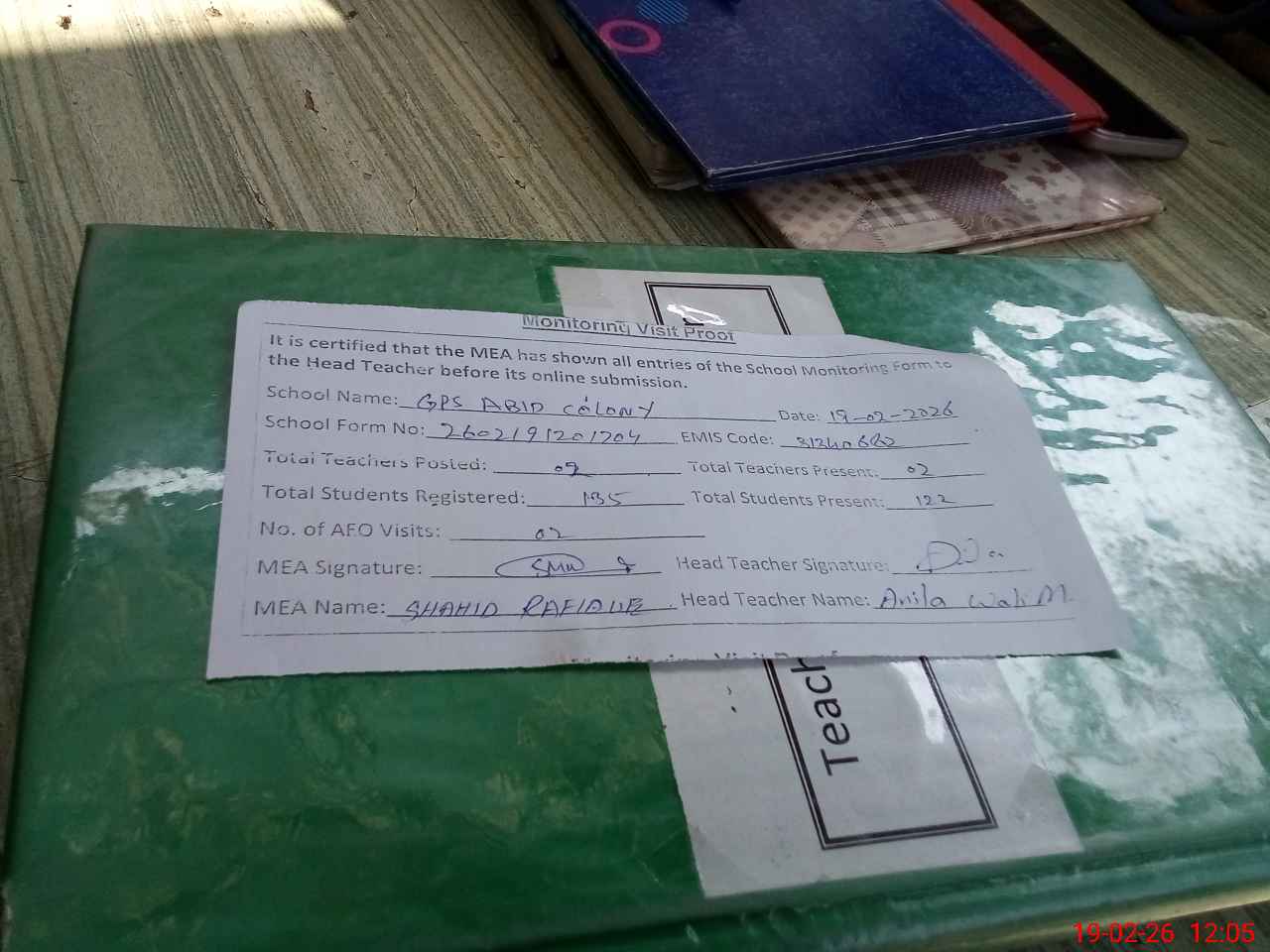 | Attendance Register | Head Teacher | MEA with School | Visit Proof |