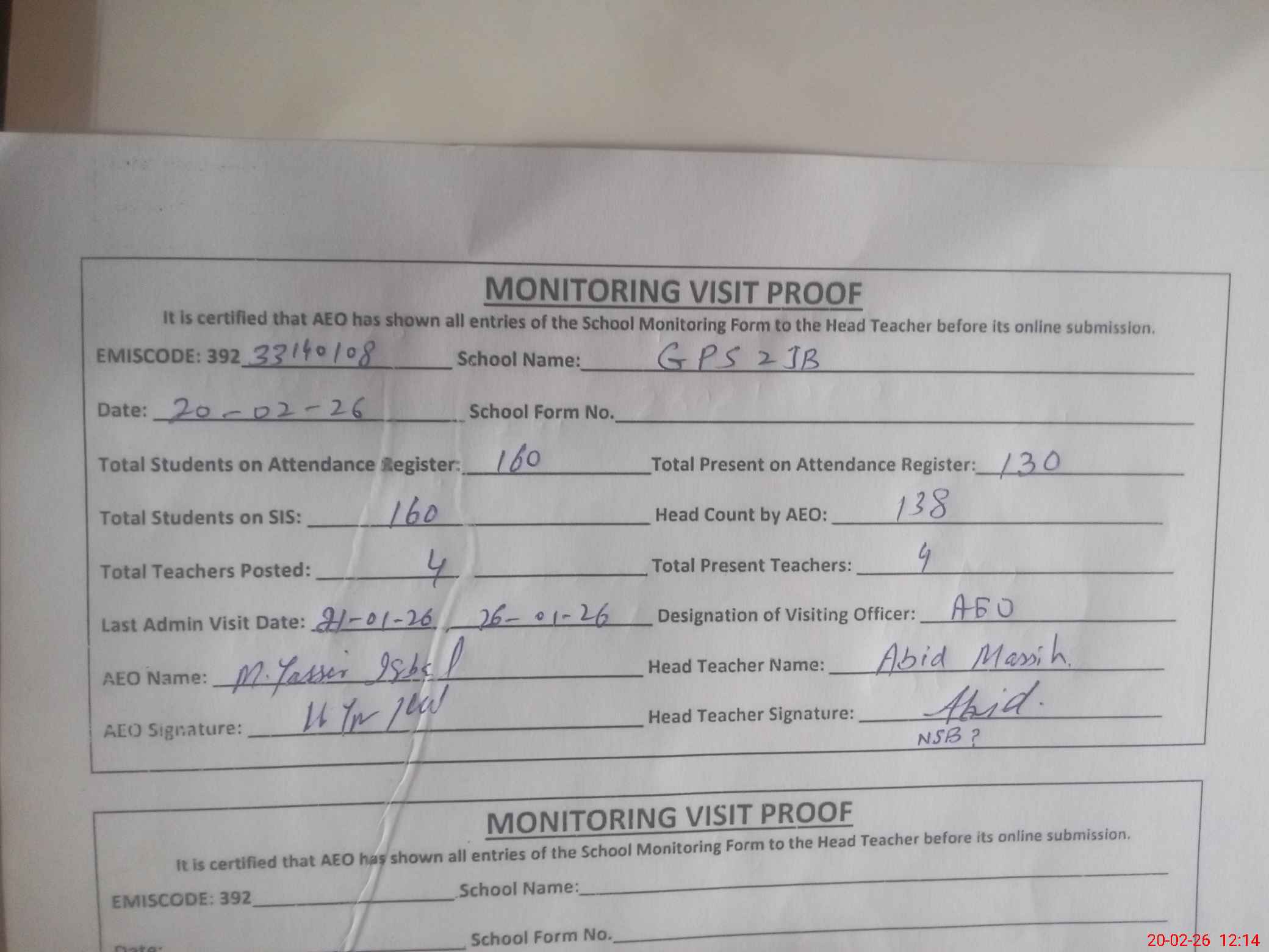| Monitoring Date: 20-02-2026 | Start Time: 20-02-2026 11:43 AM | End Time: 20-02-2026 12:14 PM | Name of MEA: M.Ya**** Iq**** | |
