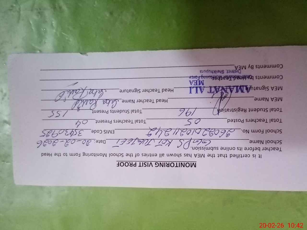 | Attendance Register | Head Teacher | MEA with School | Visit Proof |