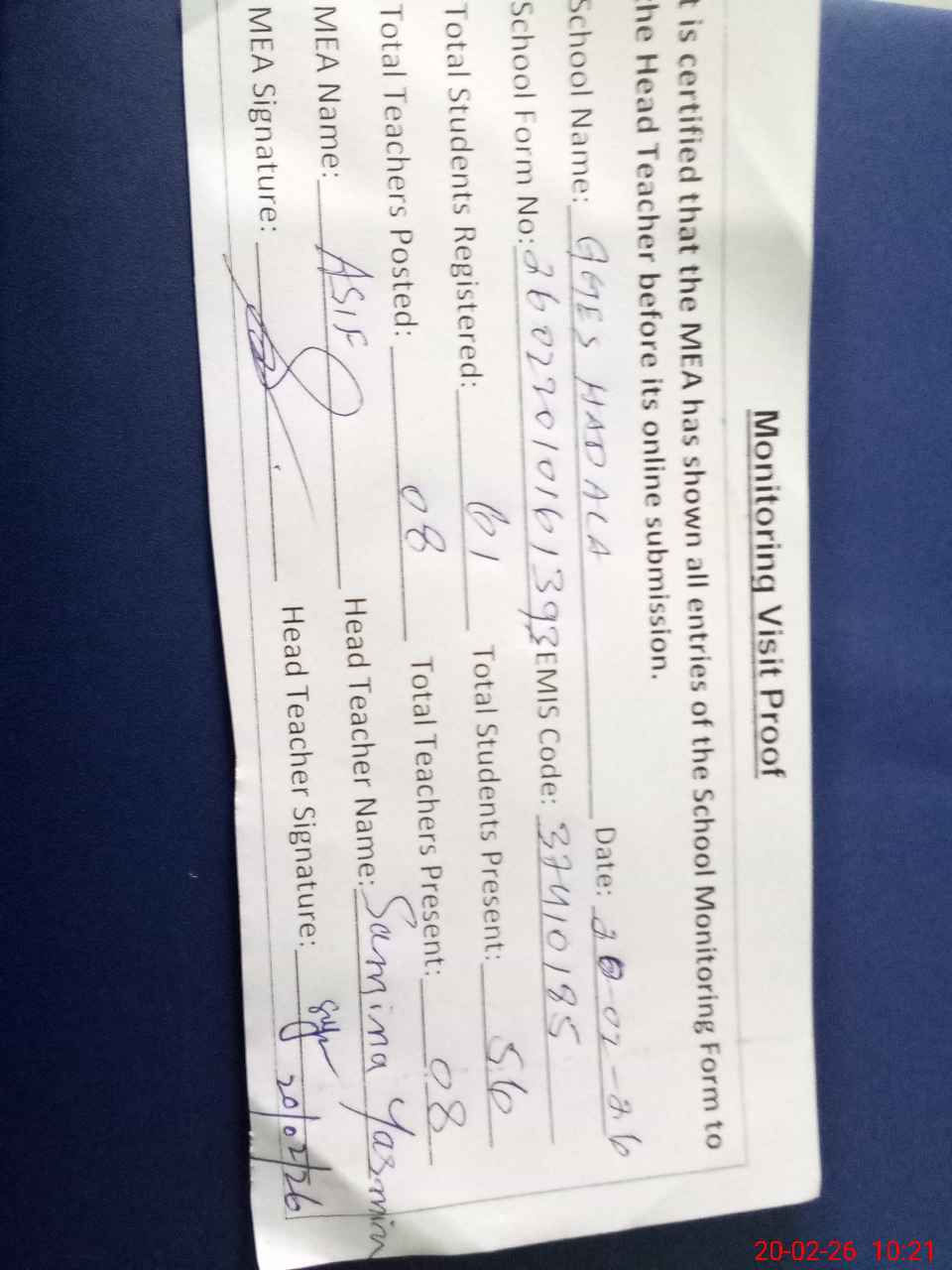 | Certified that this School was Inspected by the Undersigned MEA/DMO Today and the Information Stated Above is as Per Record. | |||||