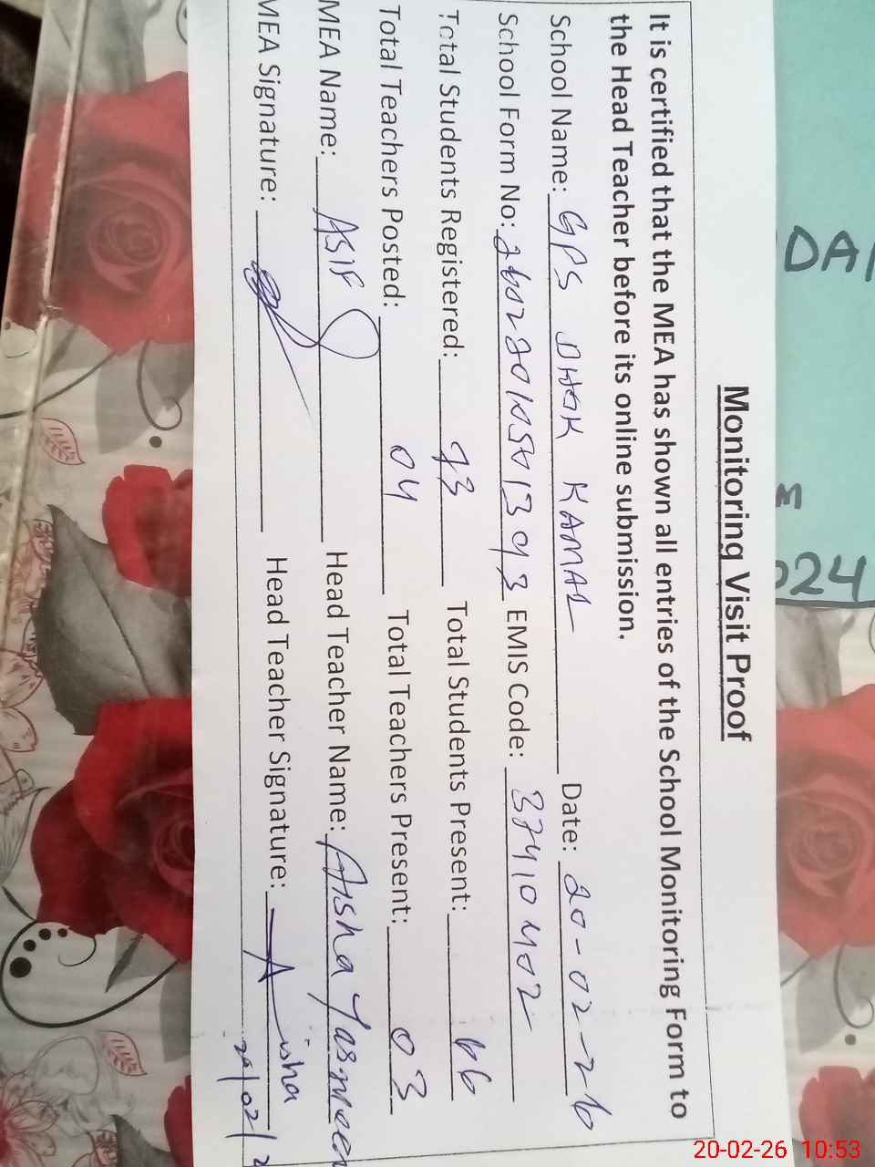 | Attendance Register | Head Teacher | MEA with School | Visit Proof |