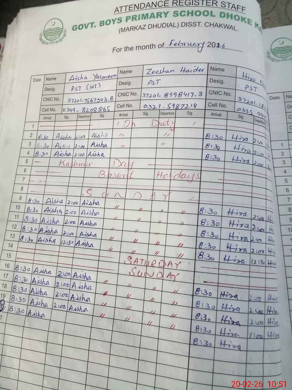 | CNIC | Full Name | Designation | R/C | Absence During Last Calender Month |