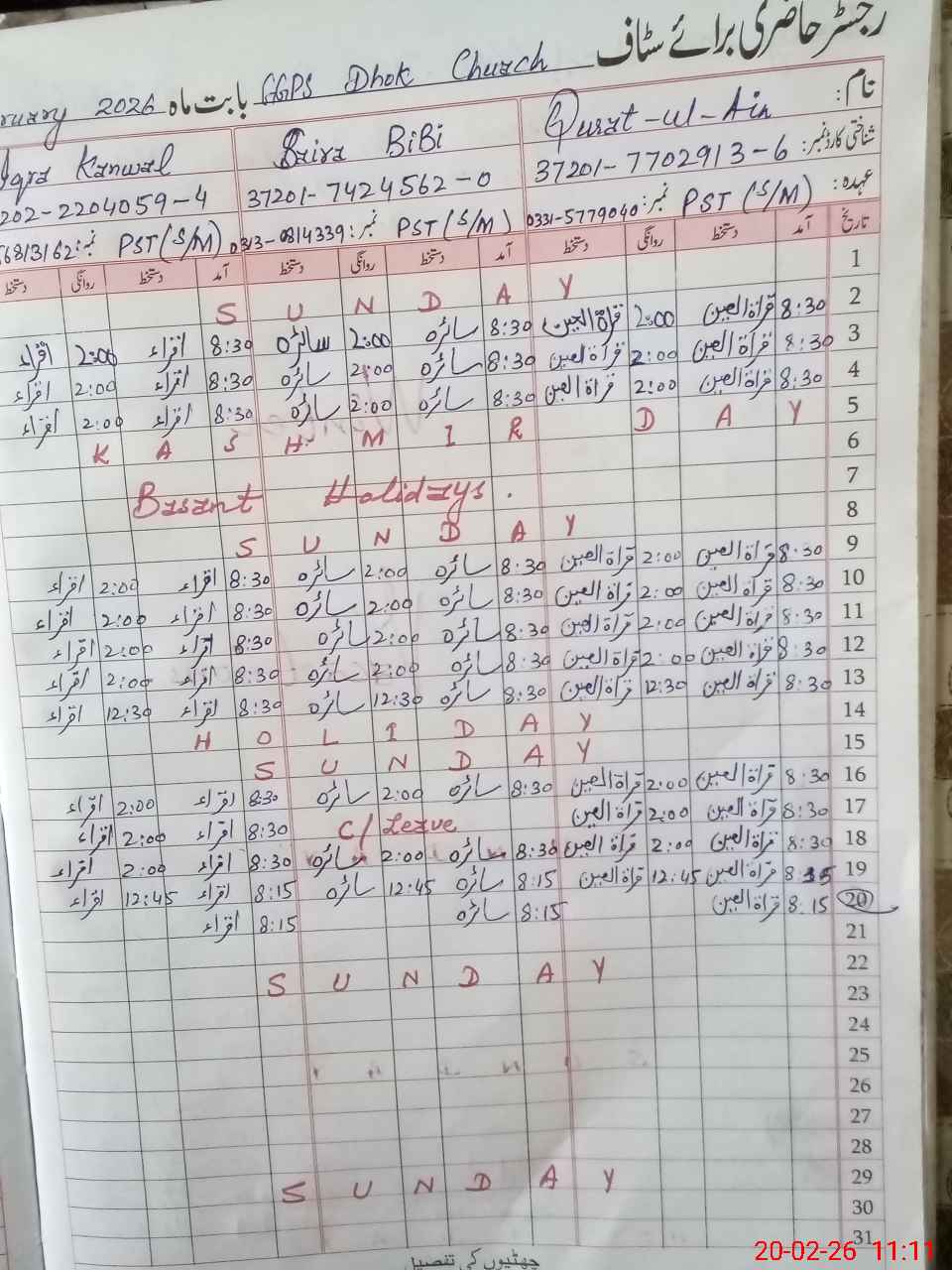 | Name: Qu**** UlAi**** Designation: (School Headmaster's/Headmistress's) HEADMISTRESS Phone/Cell Number: 03**** |