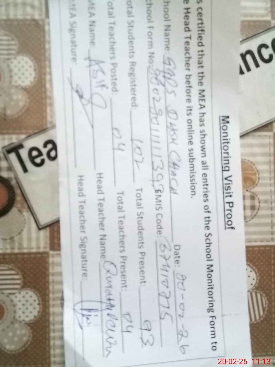 | Attendance Register | Head Teacher | MEA with School | Visit Proof |