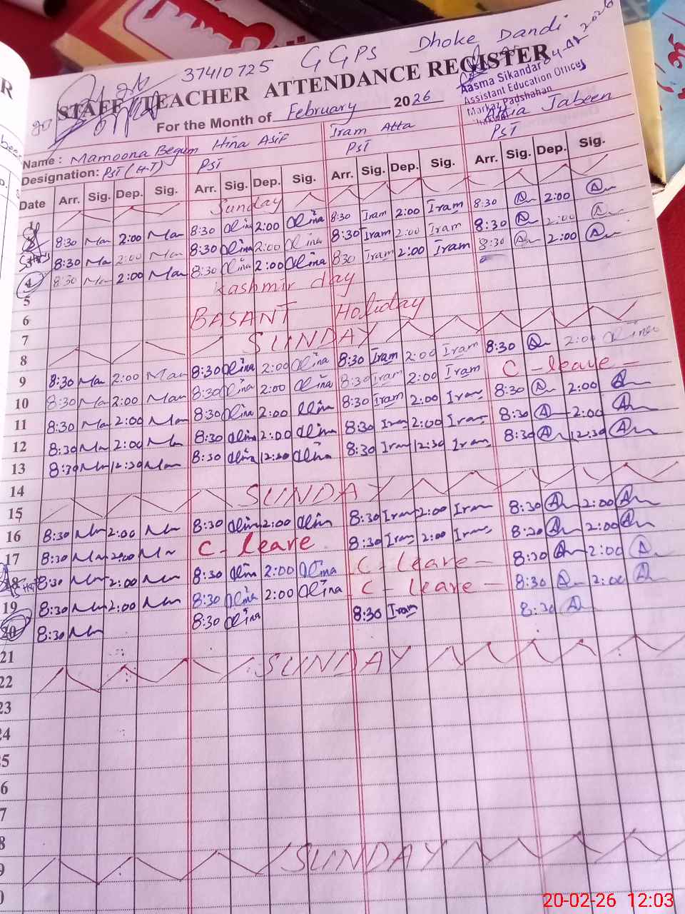 | Name: Ma**** Be**** Designation: (School Headmaster's/Headmistress's) Headmistress Phone/Cell Number: 03**** |