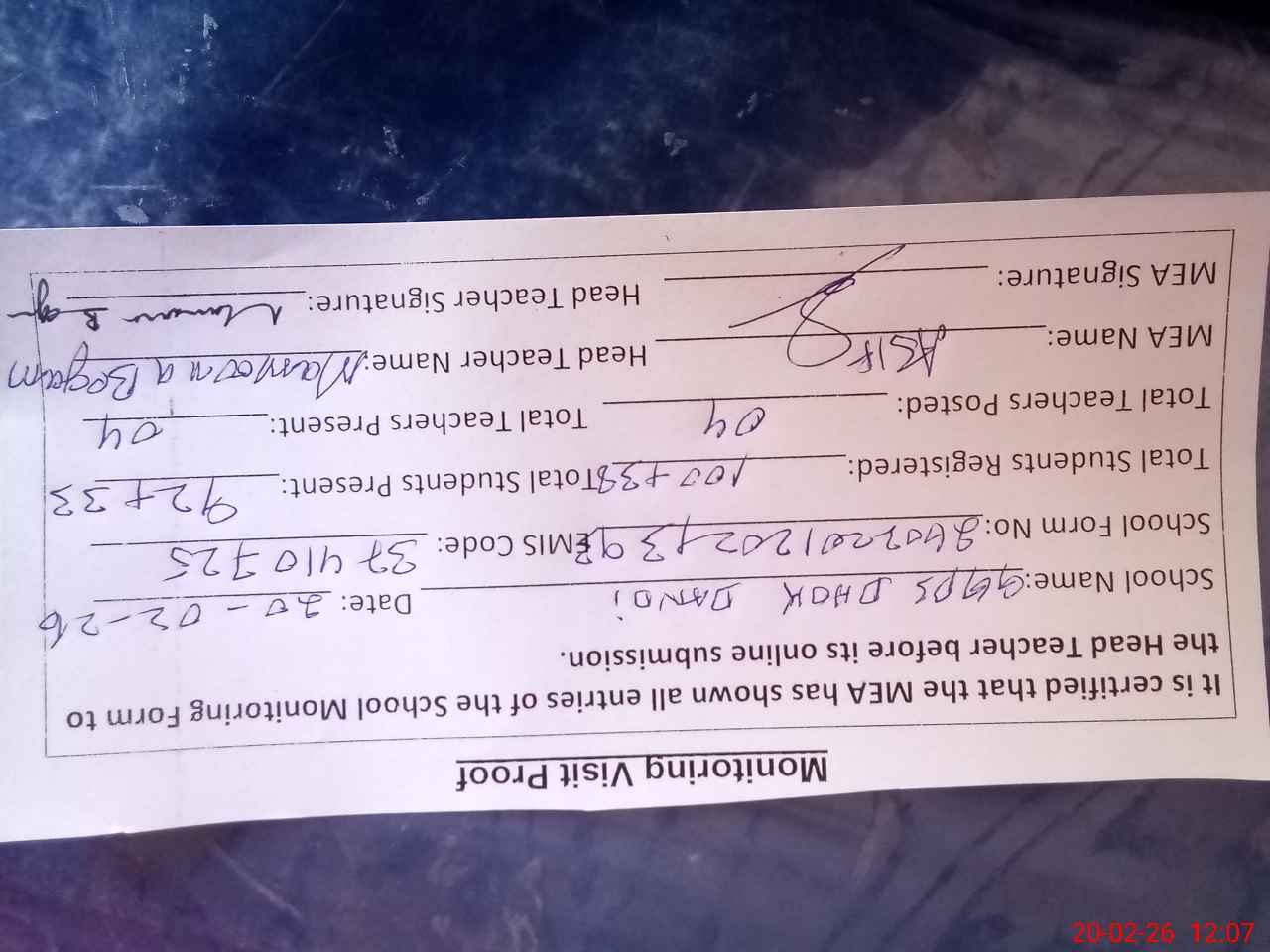 | Attendance Register | Head Teacher | MEA with School | Visit Proof |