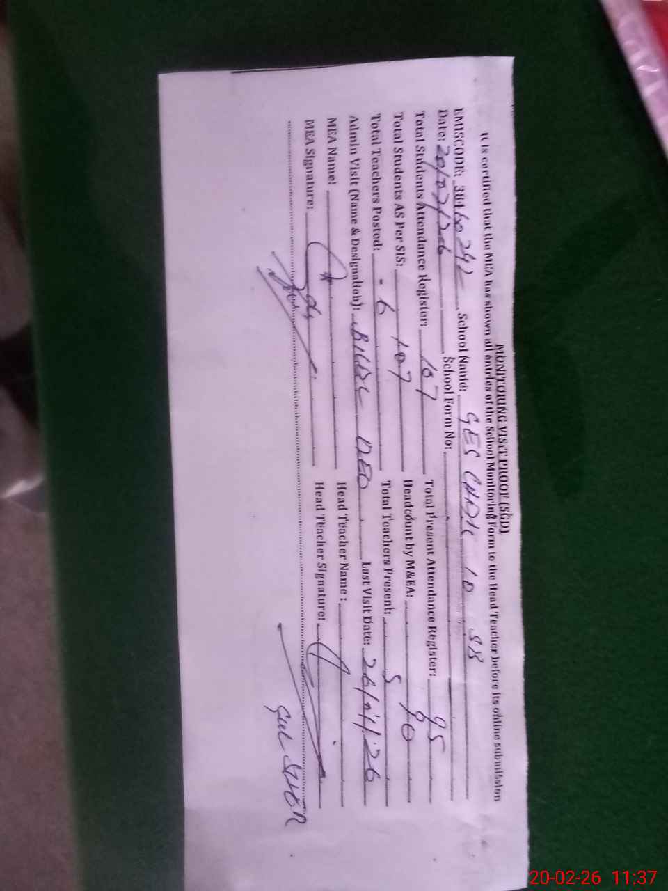 | Attendance Register | Head Teacher | MEA with School | Visit Proof |