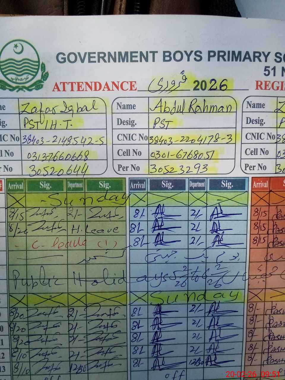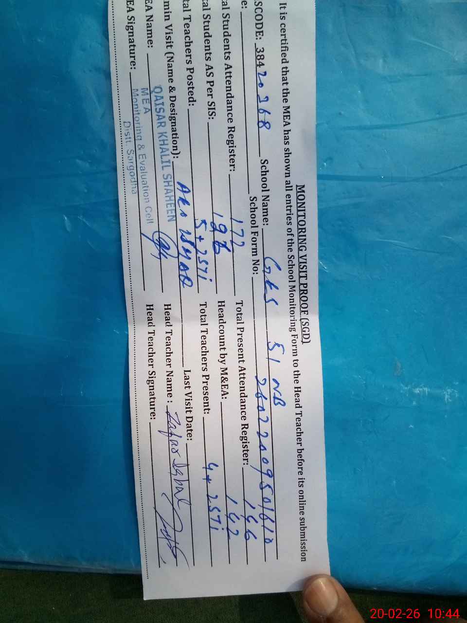 | Remarks (Use Separate Page if Required): 02 STI PRESENT AT SCHOOL NAME KAZIM ABBAS AND MAZHAR ABBAS AND 6th 7th. 8th class strength not shown on sis while available at register | |||||