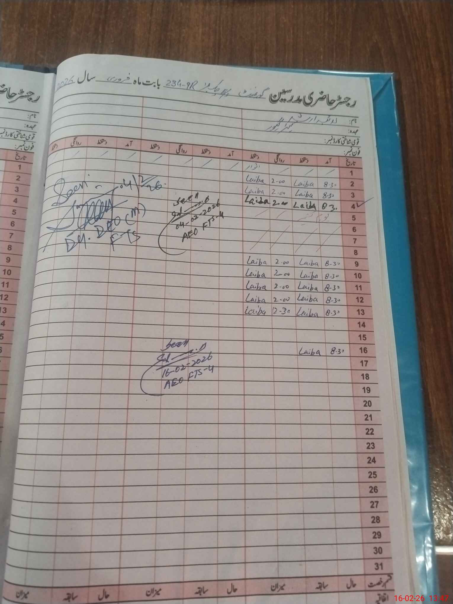 | CNIC | Full Name | Designation | R/C | Absence During Last Calender Month |